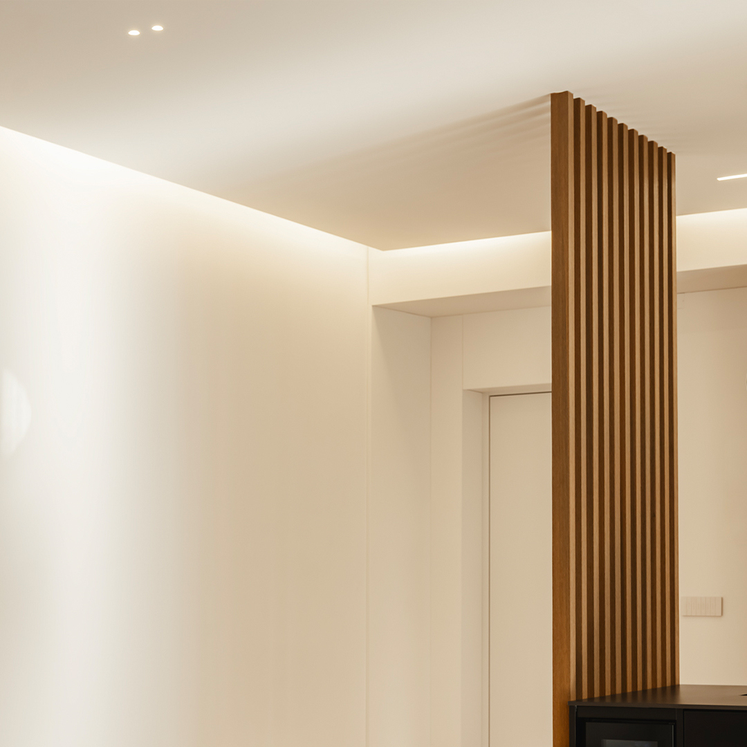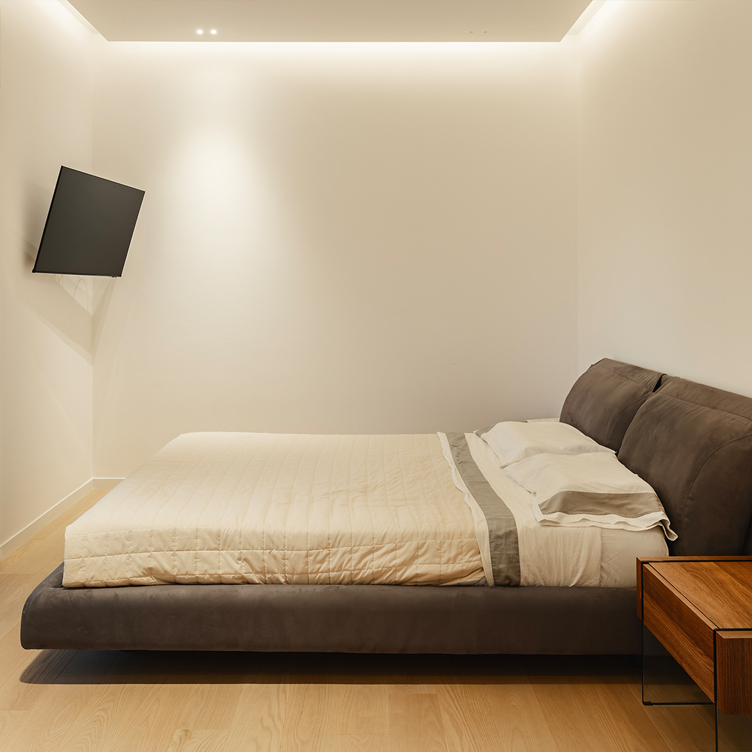 Attenzione è stata rivolta anche all'aspetto illuminotecnico degli interni con tipologie diversificate in base alla stanza/elemento da illuminare, composto dal sistema cartongesso, e dalle lampade.